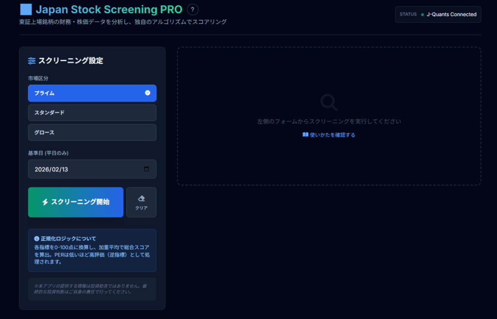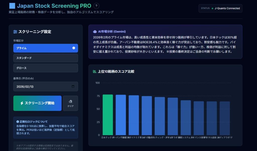 このツールは、東京証券取引所グループが提供する「J-Quants API」の公式データを使用しています。信頼性は抜群ですが、あくまで「財務データ」に基づくスコアです。