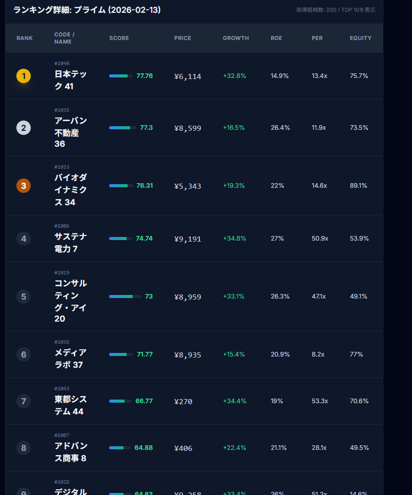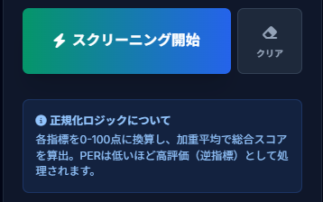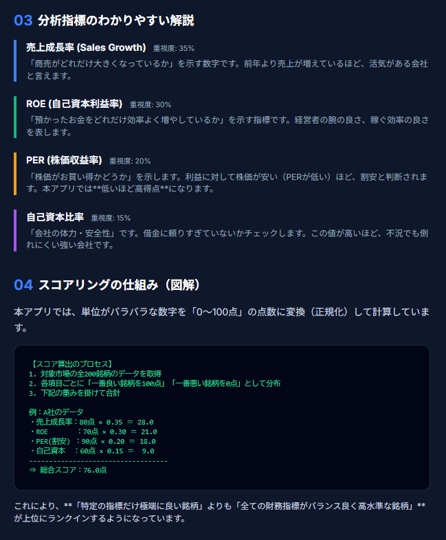 このように、スコアだけでなく、なぜその点数なのか(ROEが高い、PERが割安など)がテーブルで視覚的に確認できます。