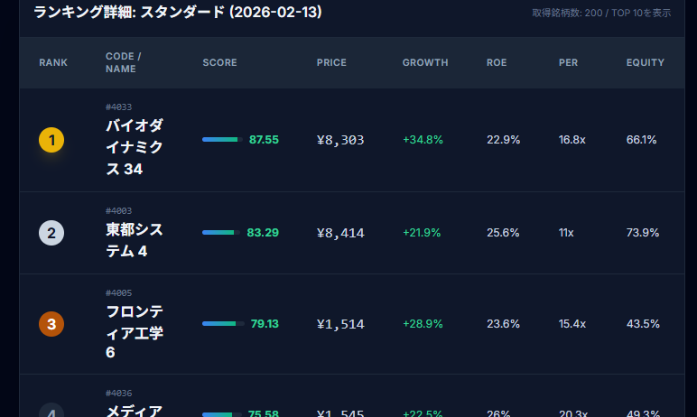 「今、財務的に強い銘柄はどれか?」をランキング形式で教えてくれるツールです。📈